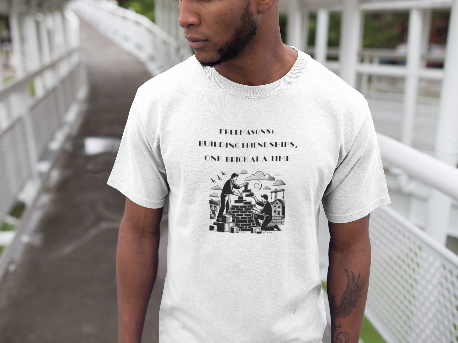 Shop our Freemason Building T-shirt, featuring a unique design of two men building a brick wall with the phrase 'Freemasons are building...' Perfect for showcasing pride in craftsmanship and brotherhood. Available in a classic white sweatshirt style for comfort and versatility. Looking to customize? The design is also available for purchase separately. Ideal for Freemasons, supporters, and anyone who values symbolism and history. Order now and wear your values with style!