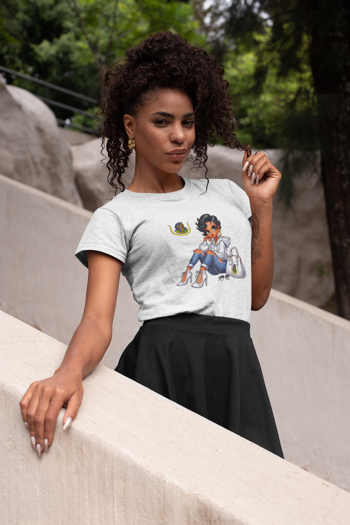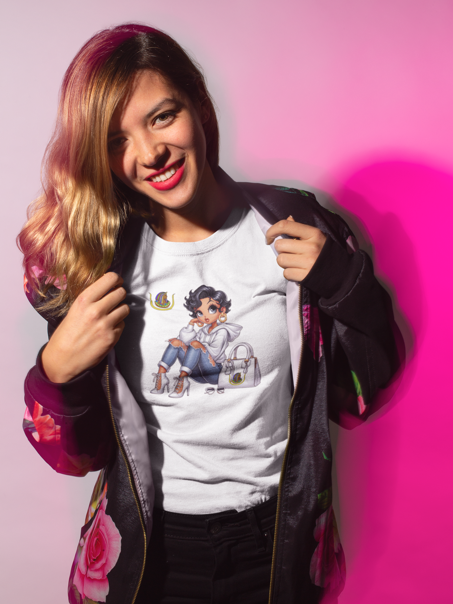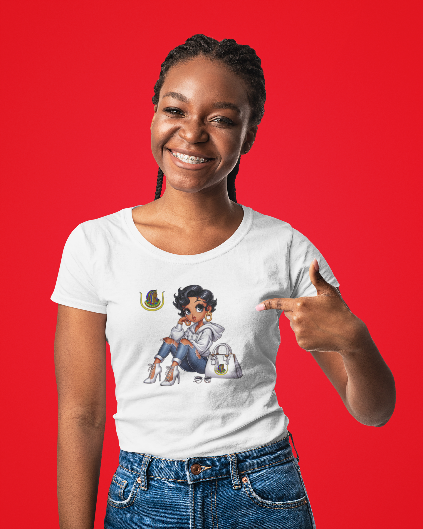 Show off your style and confidence with this chic women’s graphic t-shirt featuring a fashionable cartoon character sitting with heels, hoop earrings, and a designer-inspired bag. Perfect for fashion lovers, sorority sisters, and anyone who enjoys bold and trendy art, this tee adds personality to your everyday wardrobe. Available in white, it’s soft, breathable, and easy to pair with jeans, skirts, or layered looks. Makes a great gift for stylish women who love unique fashion statements.