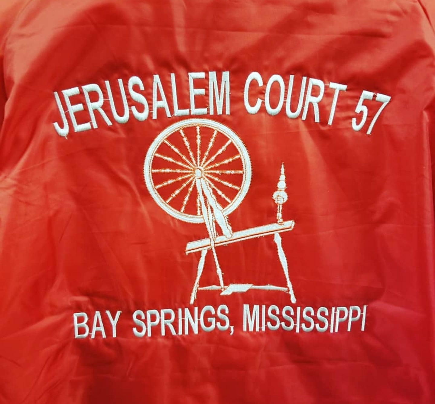 Coach's Style windbreaker with your name, Court's name, affiliation, city and state along with small spinning wheel on front, large spinning wheel on the back. HOJ applique embroidered letters on the fromt.
