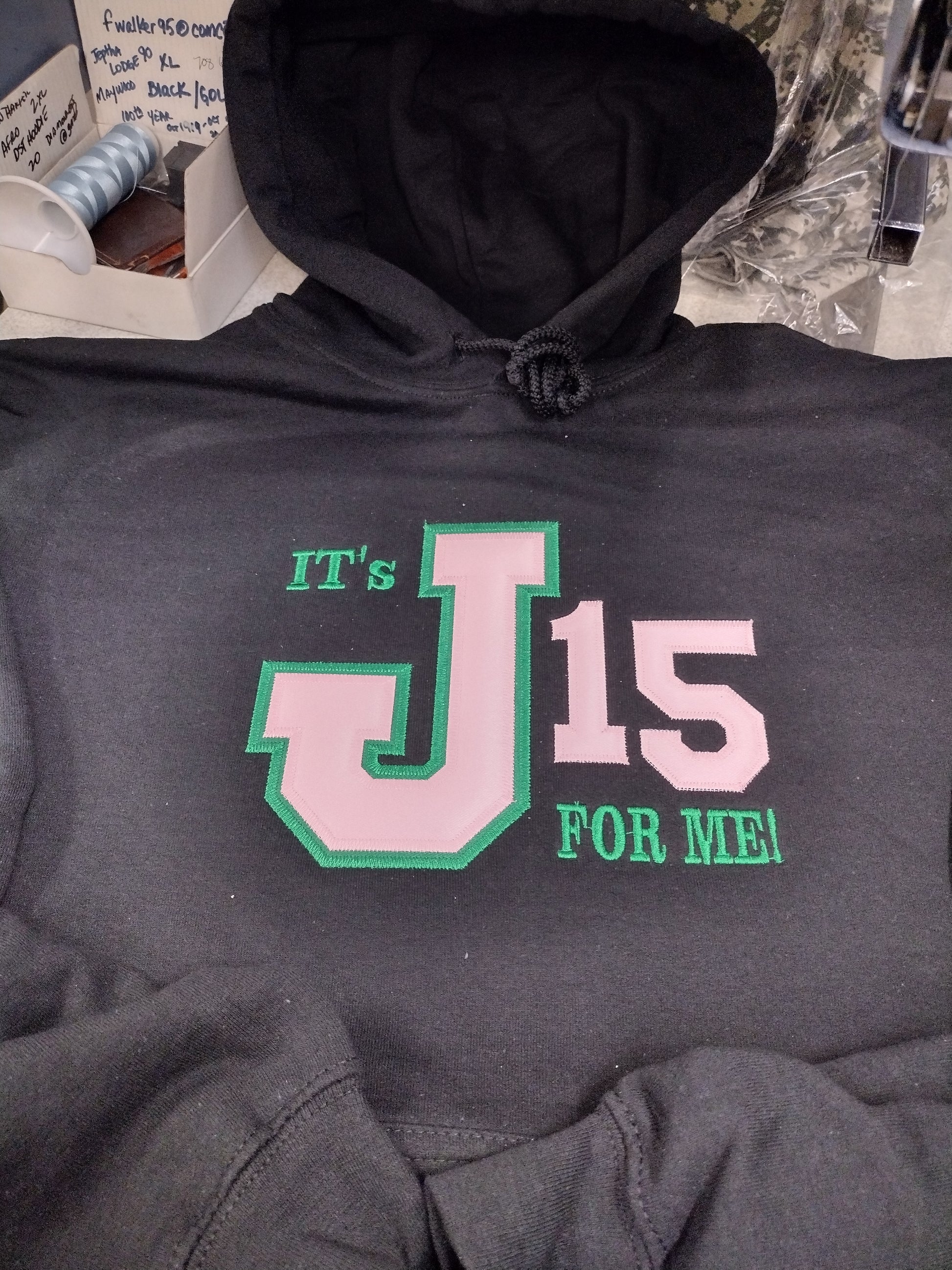 J15 black hooded unisex sweatshirt. Order yours now and have it shipped or Pick up from our show room 01-07-22.