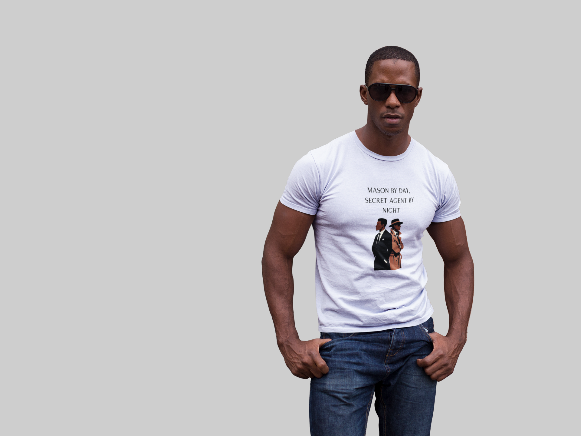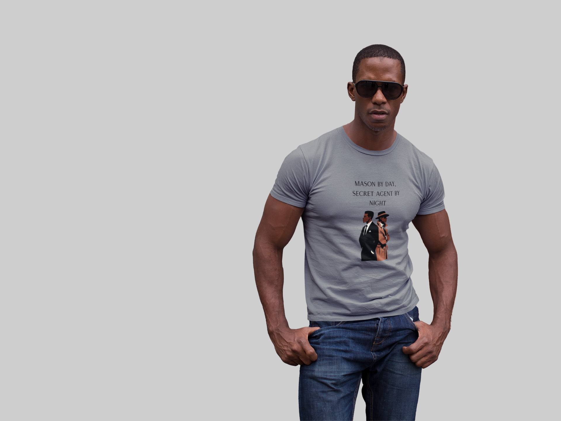 Stay stylish and cozy with our 'Mason by Day, Agent by Night' T-shirt, available in classic white and grey. Featuring a bold design of two men standing back-to-back, this shirt combines comfort and statement-making style. Perfect for any occasion, the T-shirt showcases your dual identity with pride. Prefer to customize your own apparel? Choose the design-only option and make it uniquely yours. Shop now to elevate your wardrobe!
