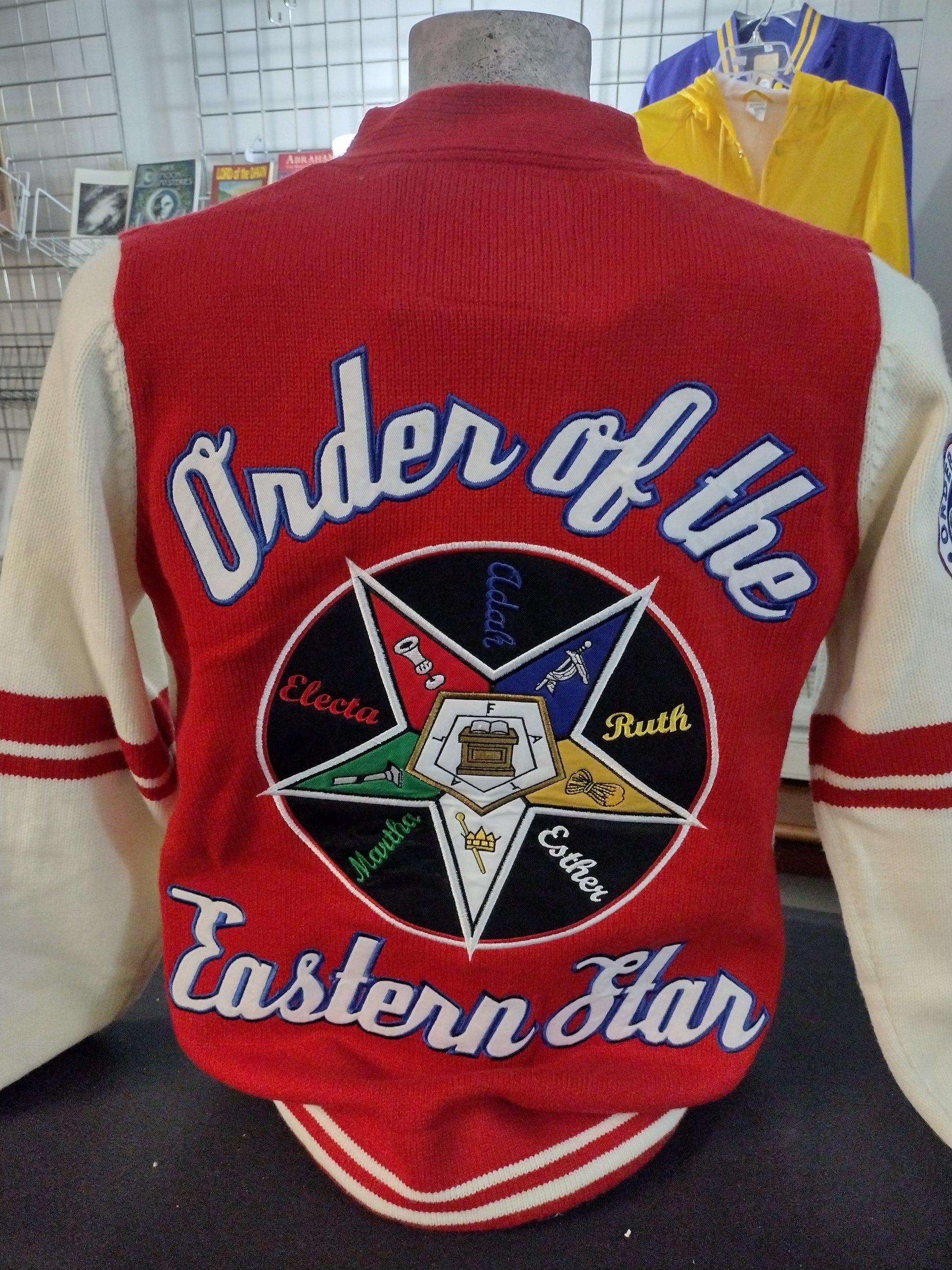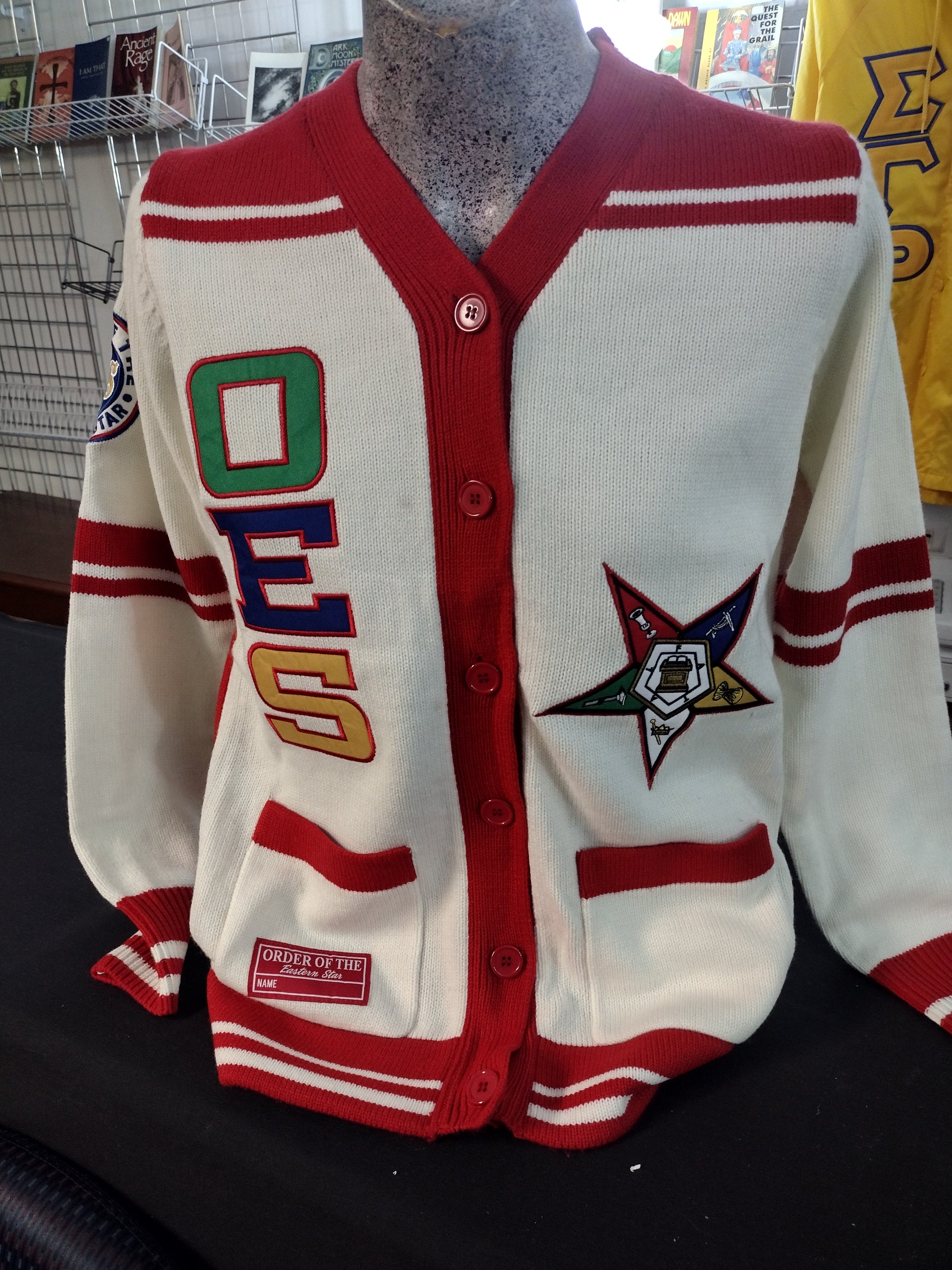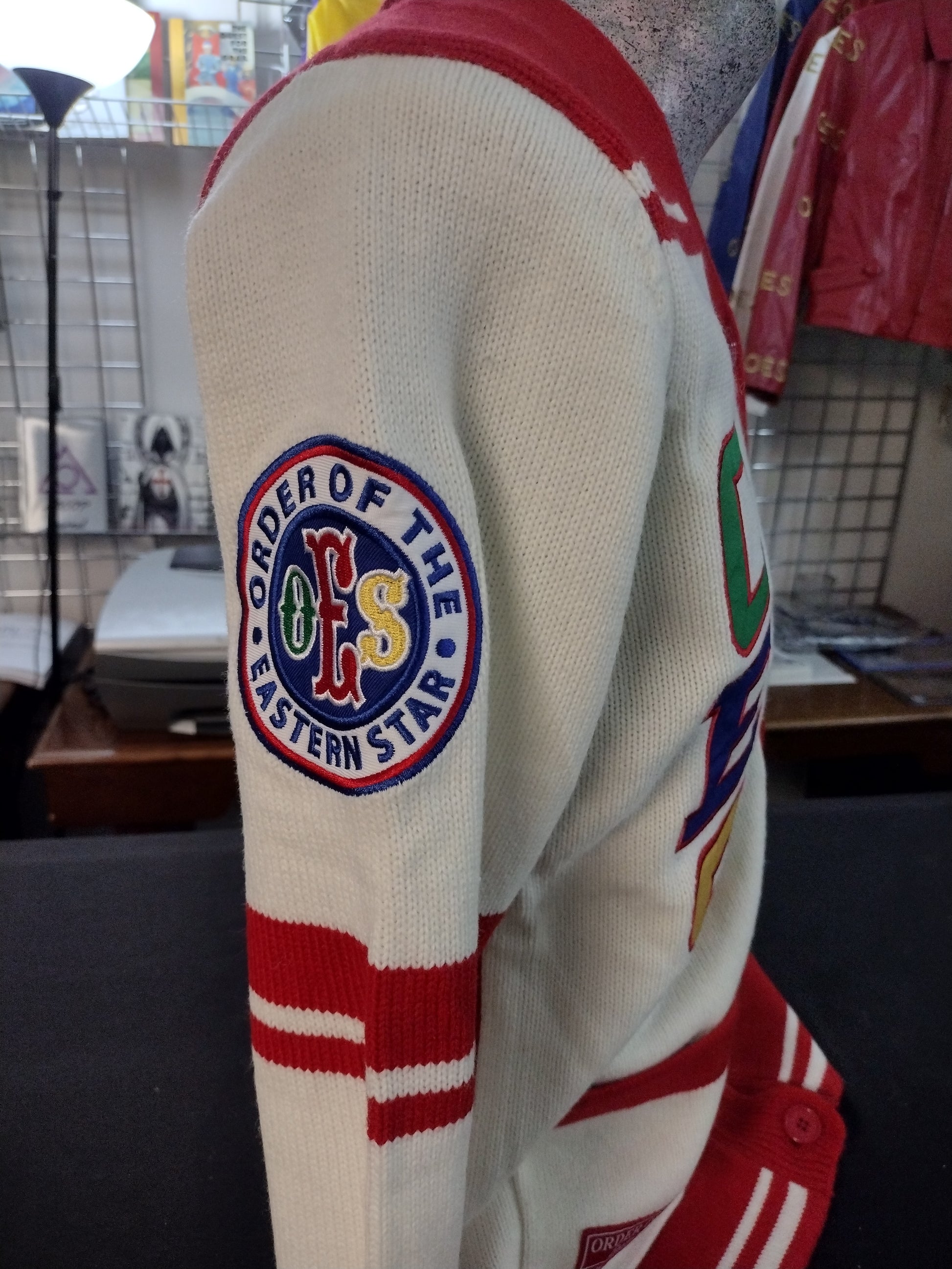 Stay stylish with our **Beautifully Embroidered White OES Varsity Sweater**, designed for members of the **Order of the Eastern Star (OES)**. Featuring intricate embroidery and a classic varsity look, this sweater is perfect for meetings or casual wear. Show your OES pride and order yours today!