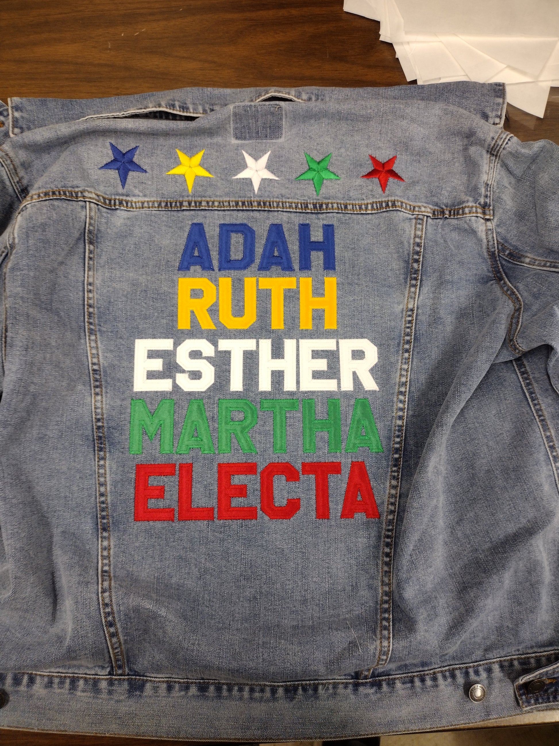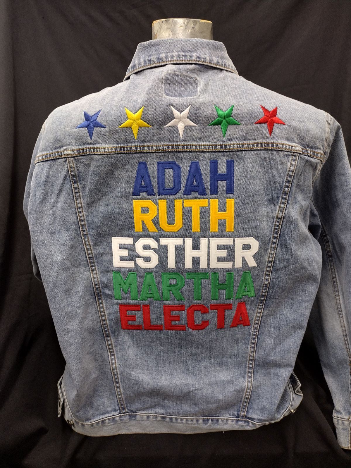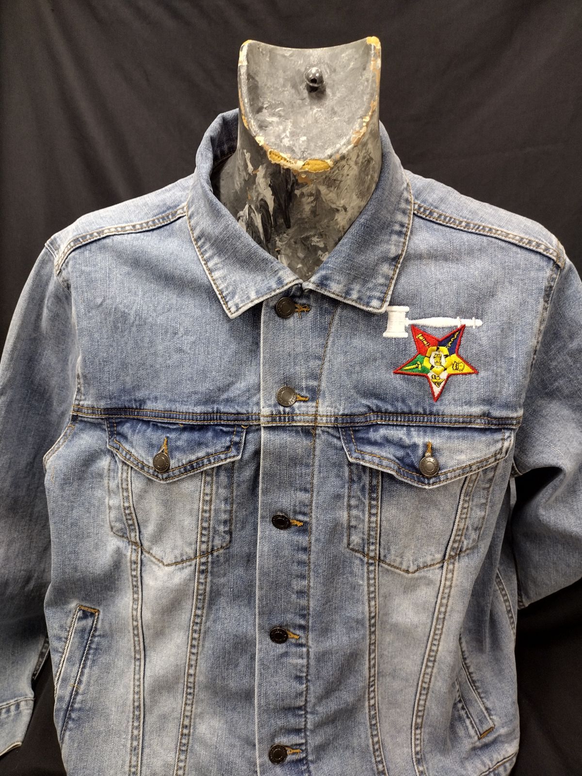 The combination of the light blue denim, the vibrant stars, and the heroines' names creates a harmonious blend of style and symbolism. The jacket not only serves as a fashion statement but also as a representation of the values and camaraderie associated with the Order of the Eastern Star. Whether worn casually or as a part of a specific event, this jacket is sure to attract attention and spark conversations about its unique design and meaningful symbolism.